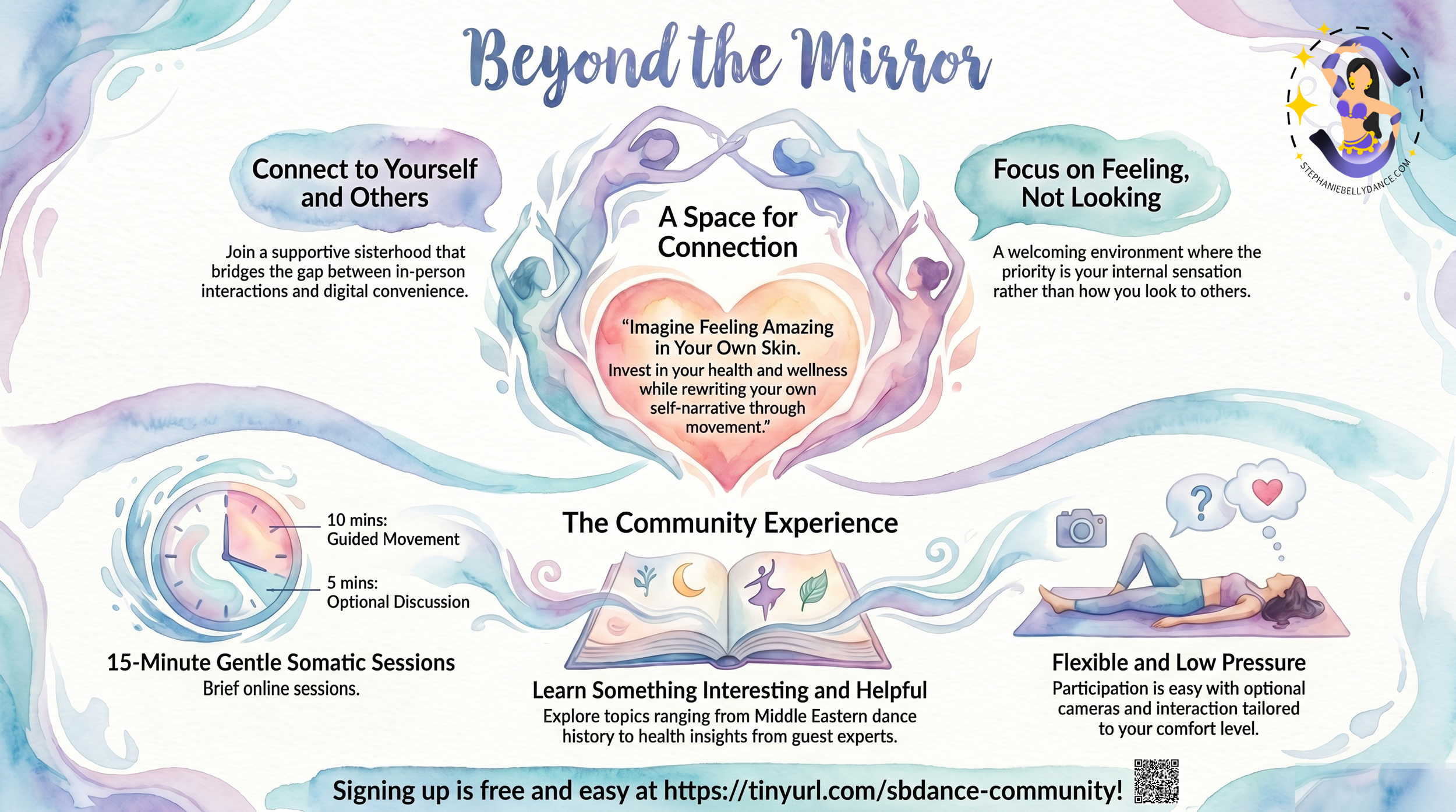 To reduce the risk of injury, before beginning this or any other exercise program, please consult a healthcare provider for appropriate exercise prescription and safety precautions. The instruction and advice presented are in no way intended as a substitute for medical or expert consultation. Risks of participating in any movement class may include, but are not limited to, physical or psychological injury, pain, and economic loss. Stephanie Belly Dance LLC (and stephaniebellydance.com) disclaims any liability from and in connection with the content that it provides. By continuing, you agree to assume all related risks, both known or unknown, directly and indirectly associated with your participation in any service or content offered by Stephanie Belly Dance LLC. As with any exercise program, if at any point during your workout you begin to feel faint, dizzy or have physical discomfort, you should stop immediately and consult your physician.